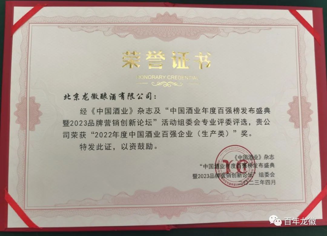 4月9日,《中國酒業(yè)雜志》主辦的中國酒業(yè)年度百強榜發(fā)布盛典暨2023品牌營(yíng)銷(xiāo)創(chuàng )新論壇在成都隆重開(kāi)幕。北京龍徽釀酒有限公司憑借百年的匠心產(chǎn)品力與“雙老字號”的卓越品牌力,通過(guò)層層嚴苛評選,榮登中國酒業(yè)年度百強(生產(chǎn)類(lèi))榜單!